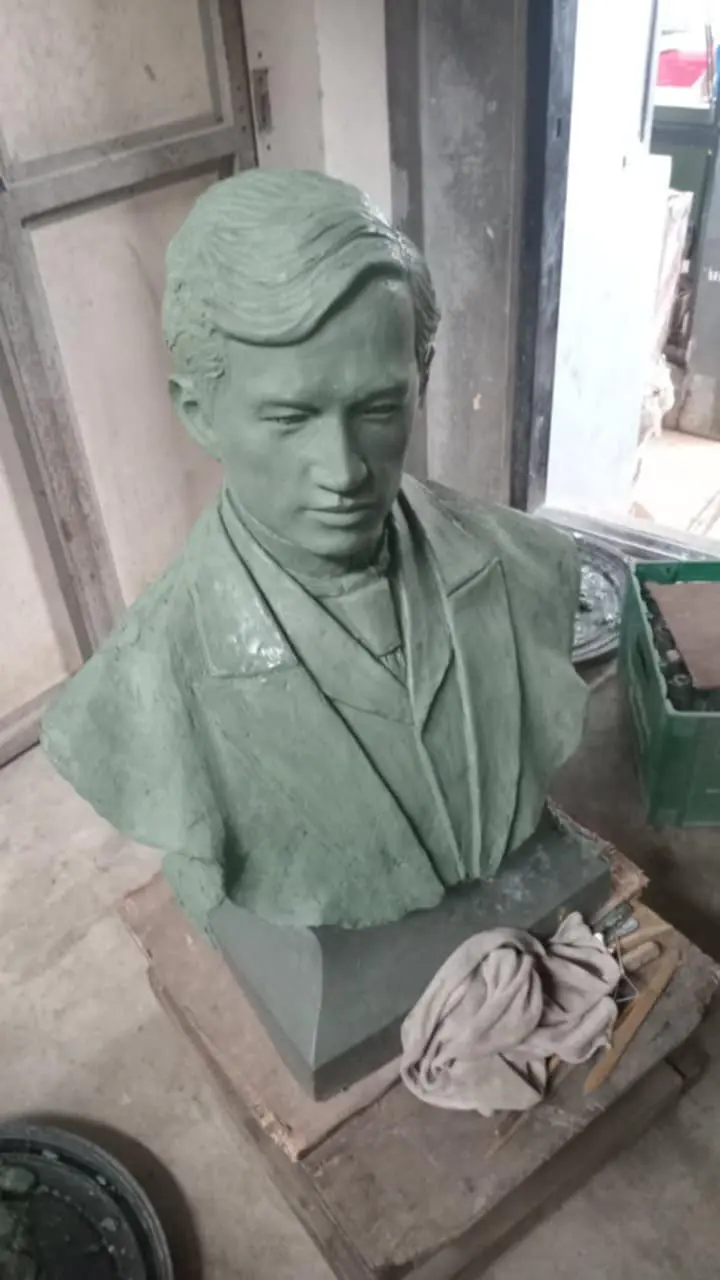 Bronze bust near corporate building signage in Quezon City, man with mustache and suit, indoors. By M&G Global Ads.