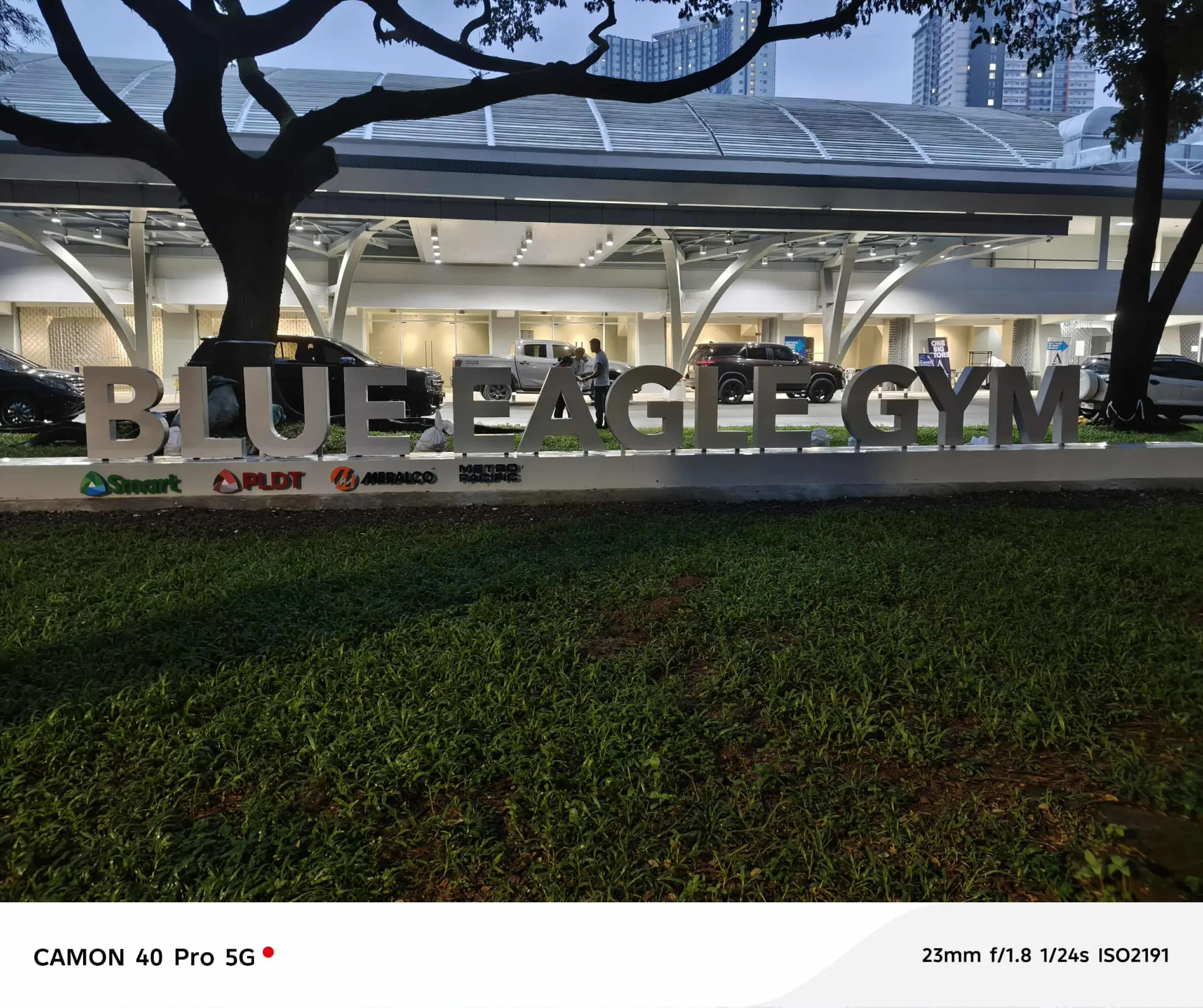 People at Mandaluyong Arena, Metro Manila, with blue LED acrylic building signage by sign maker Philippines, by M&G Global Ads.