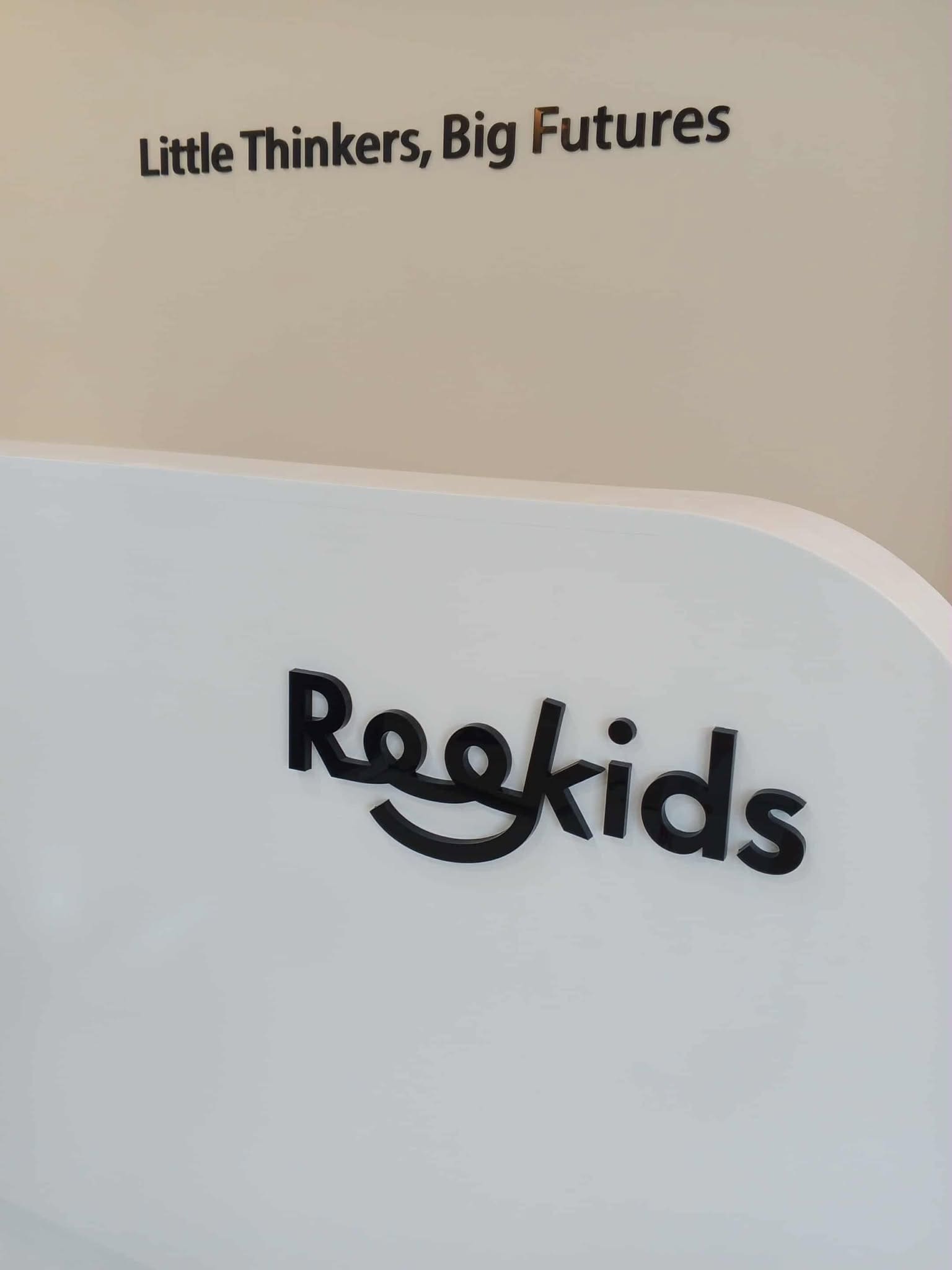 Indoor acrylic reception signage for Rookids, with motivational text above. Sign maker Philippines by M&G Global Ads. Metro Manila.