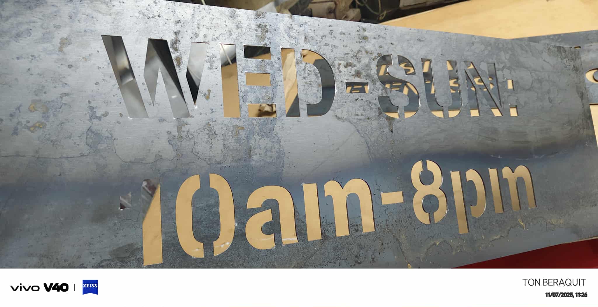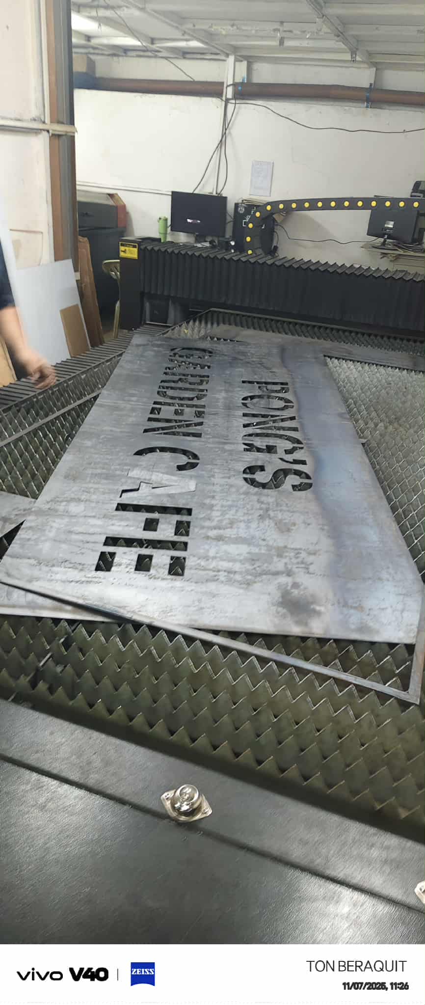 Stainless steel signage laser cutting fabrication in Metro Manila by sign maker Philippines, workspace view. By M&G Global Ads.