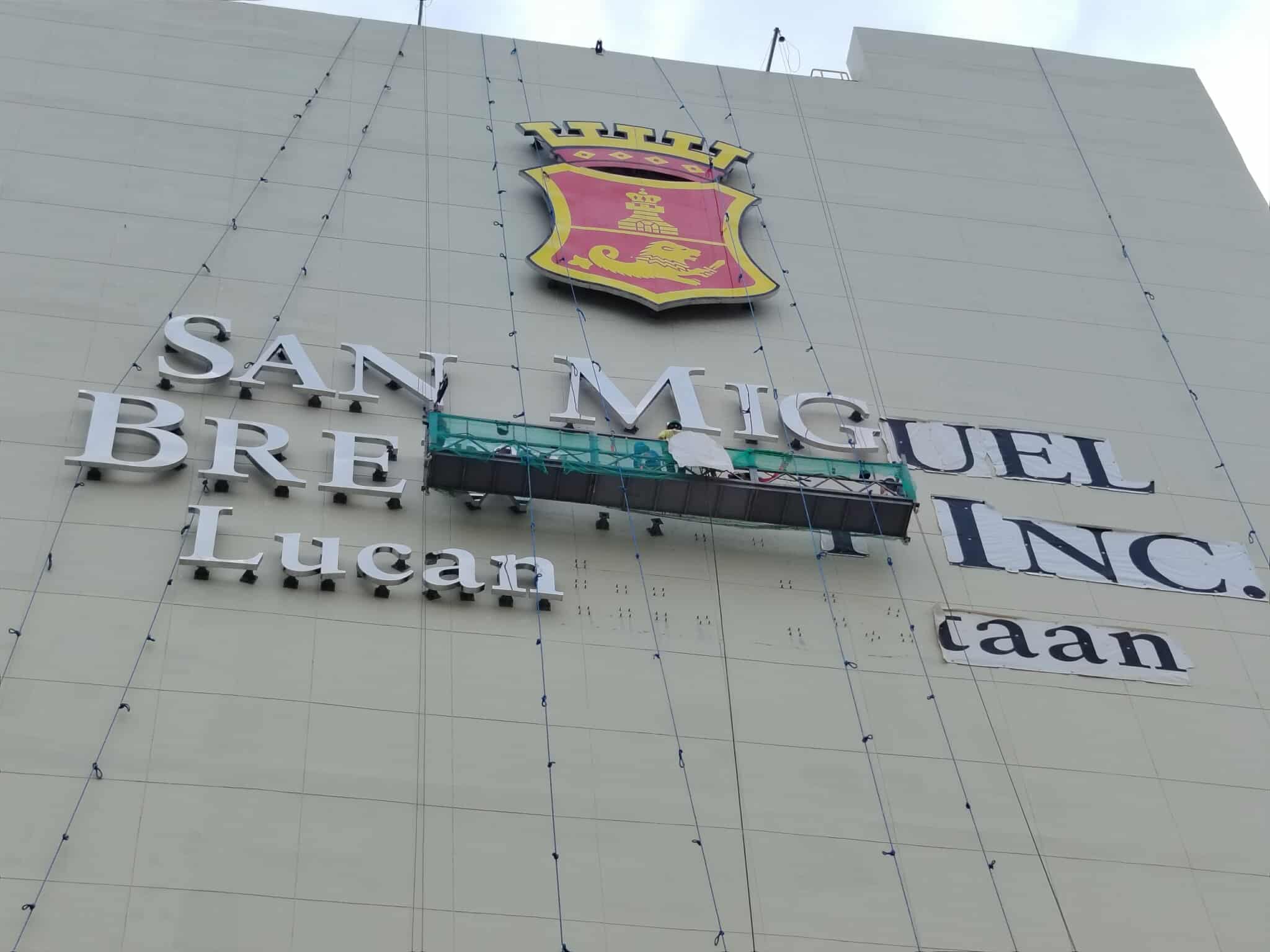 Workers maintain San Miguel Brewery Inc. acrylic building signage with red and yellow crest in Lucanin, Pa.; sign maker Philippines by M&G Global Ads.