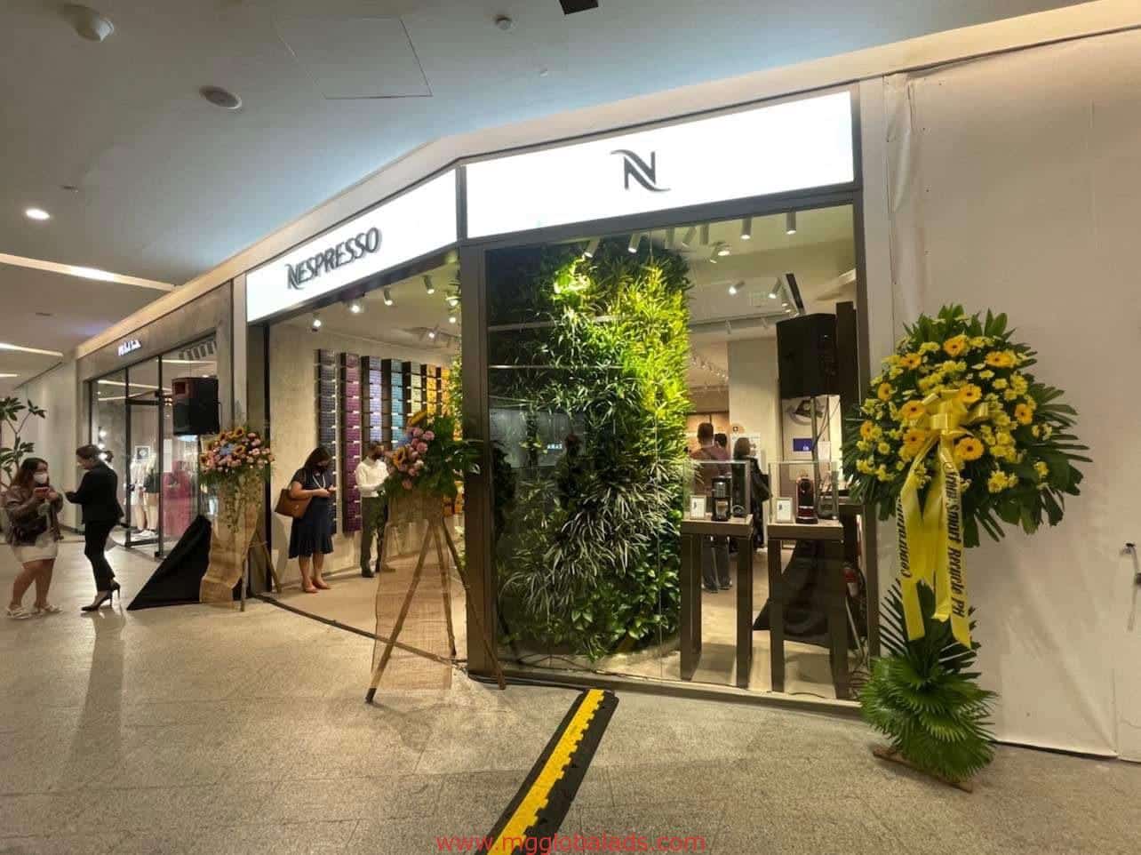 Nespresso LED signage store in Makati mall with plant wall, coffee machines, flower stands at entrance by M&G Global Ads.