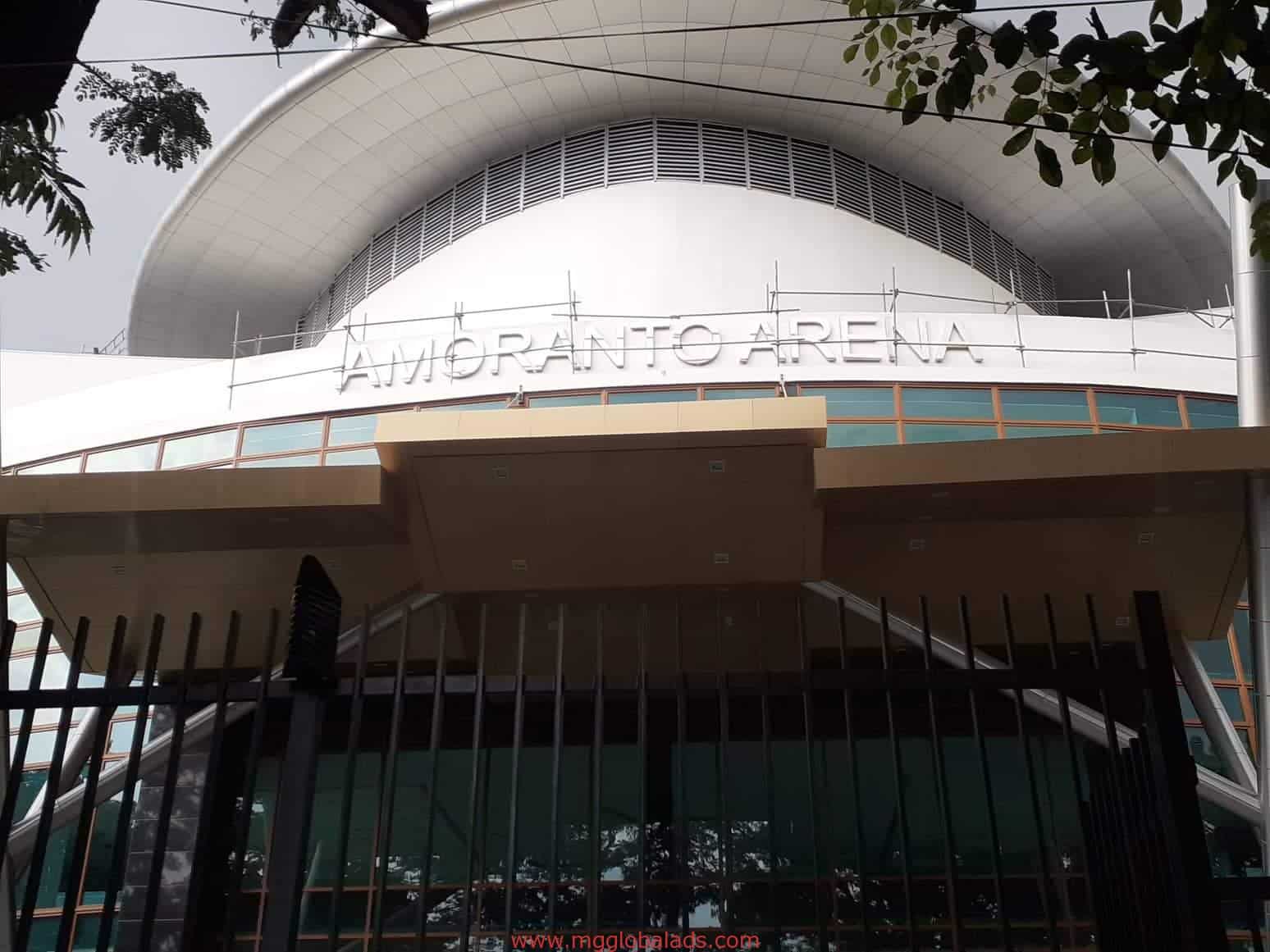 Amoranto Arena channel letter signage on a modern building in Quezon City, behind fence and trees, by M&G Global Ads.