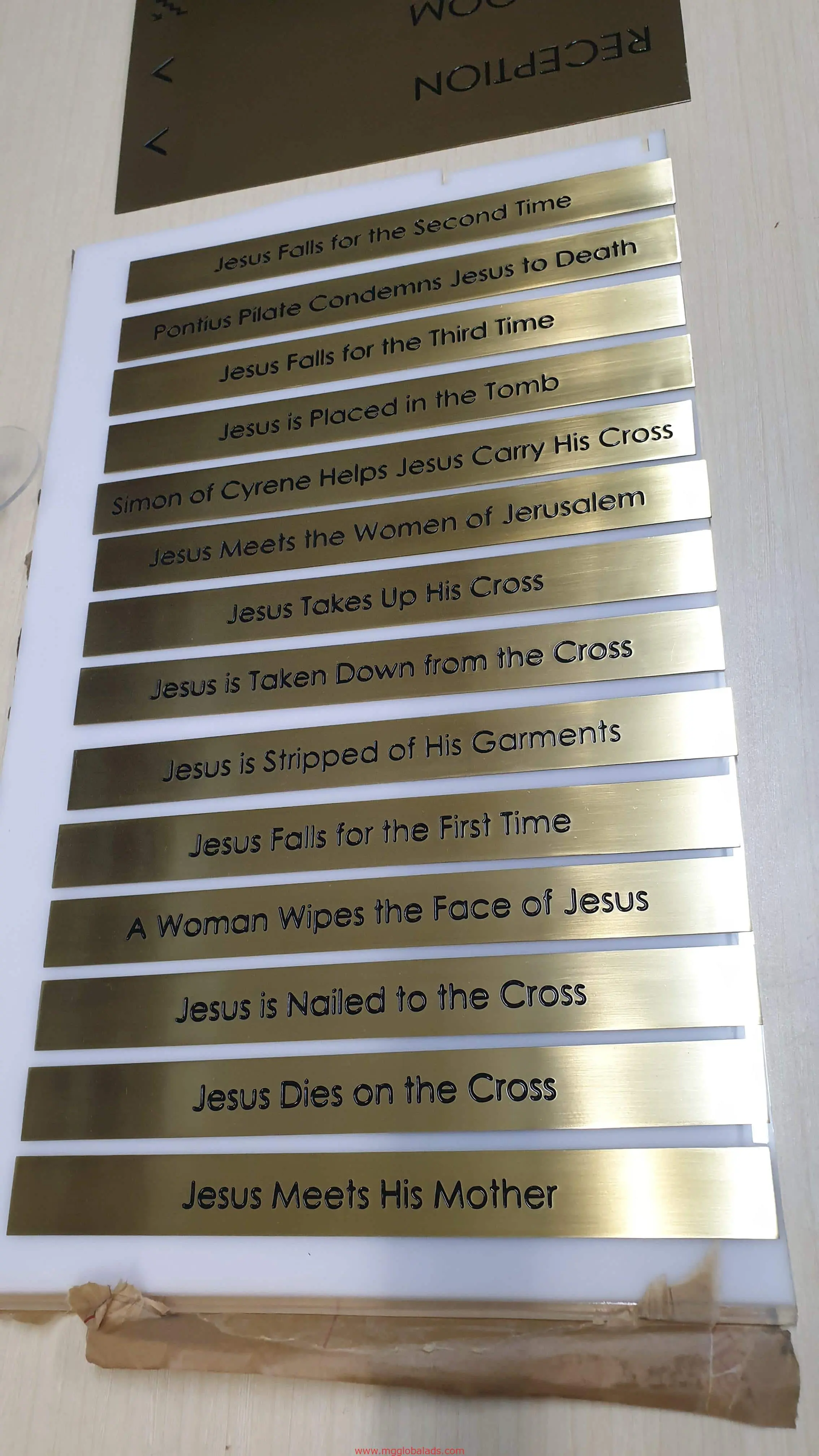 Gold metallic station of the cross plaques signage with black text, Ortigas installation detailing Jesus journey by M&G Global Ads.