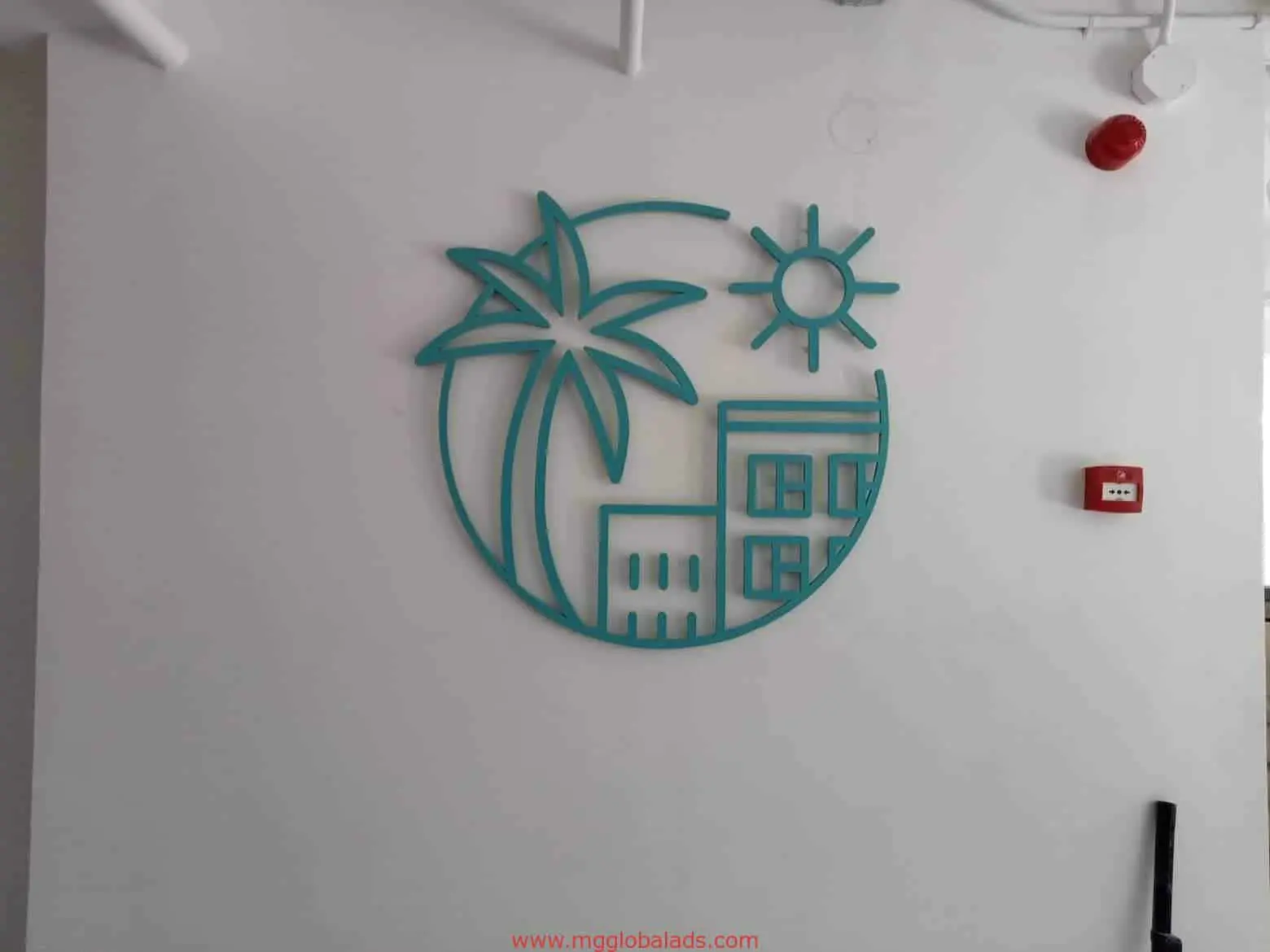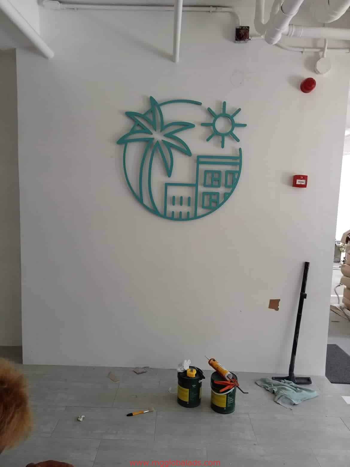 Teal acrylic signage wall art, palm tree design, on white wall with tools below in Makati by M&G Global Ads.