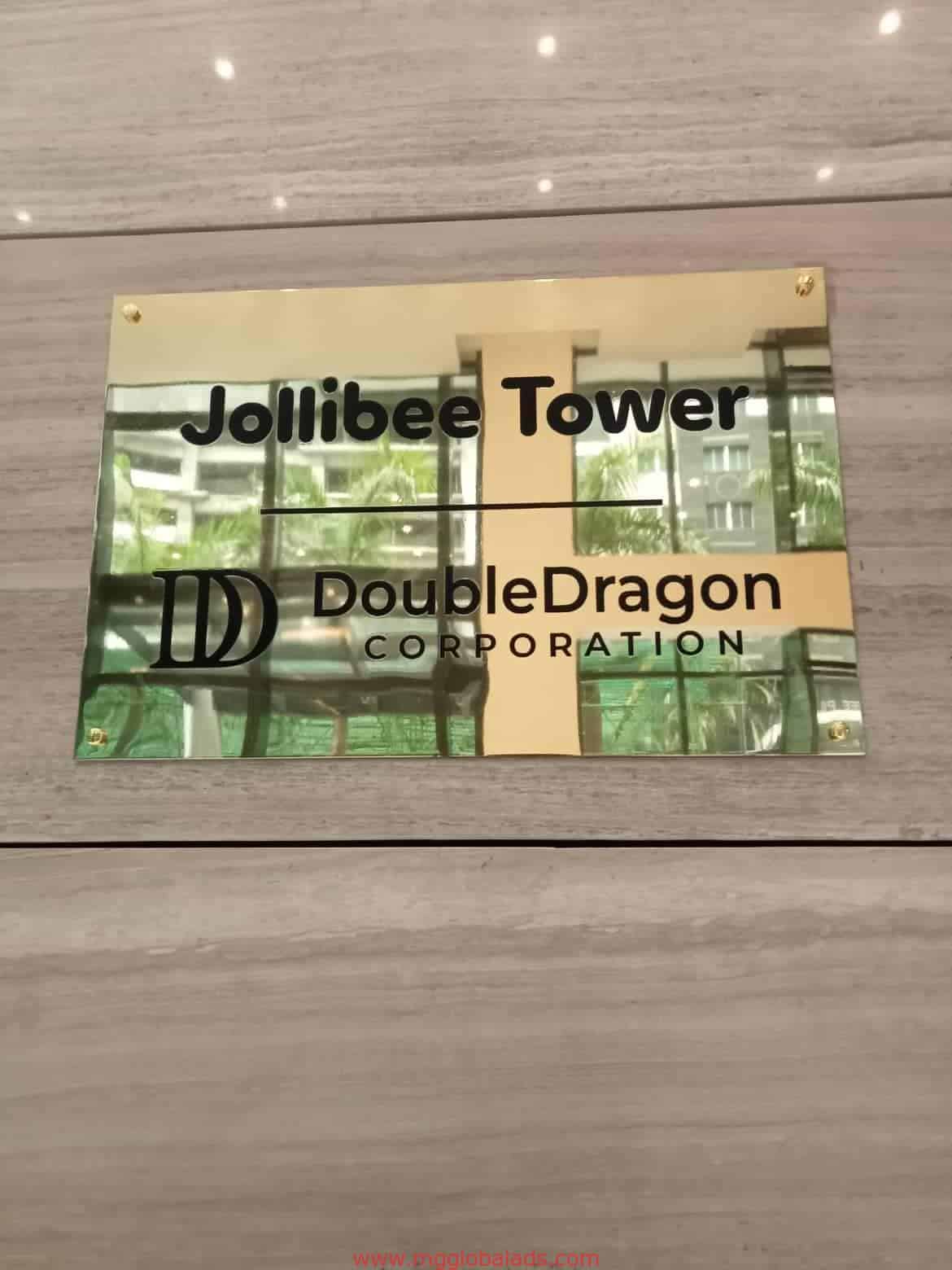 Acrylic desk signage for DoubleDragon Corporation at Jollibee Tower, Ortigas, with gold color and black text by M&G Global Ads.
