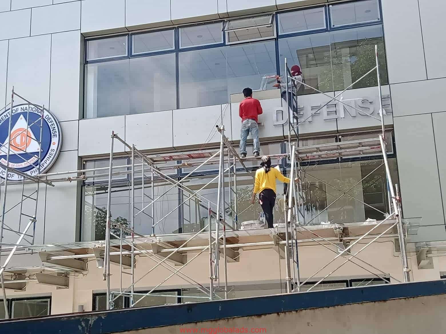 Workers installing aluminum signage for Office of National Defense, Makati, on scaffolding. Project by M&G Global Ads.
