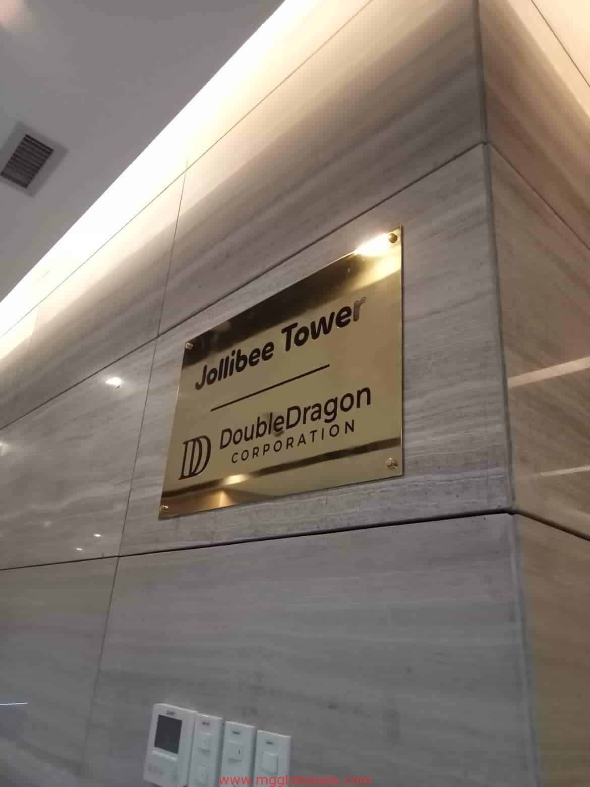 Jollibee Tower building plaque signage with DoubleDragon logo in Ortigas, four switches below it. By M&G Global Ads.