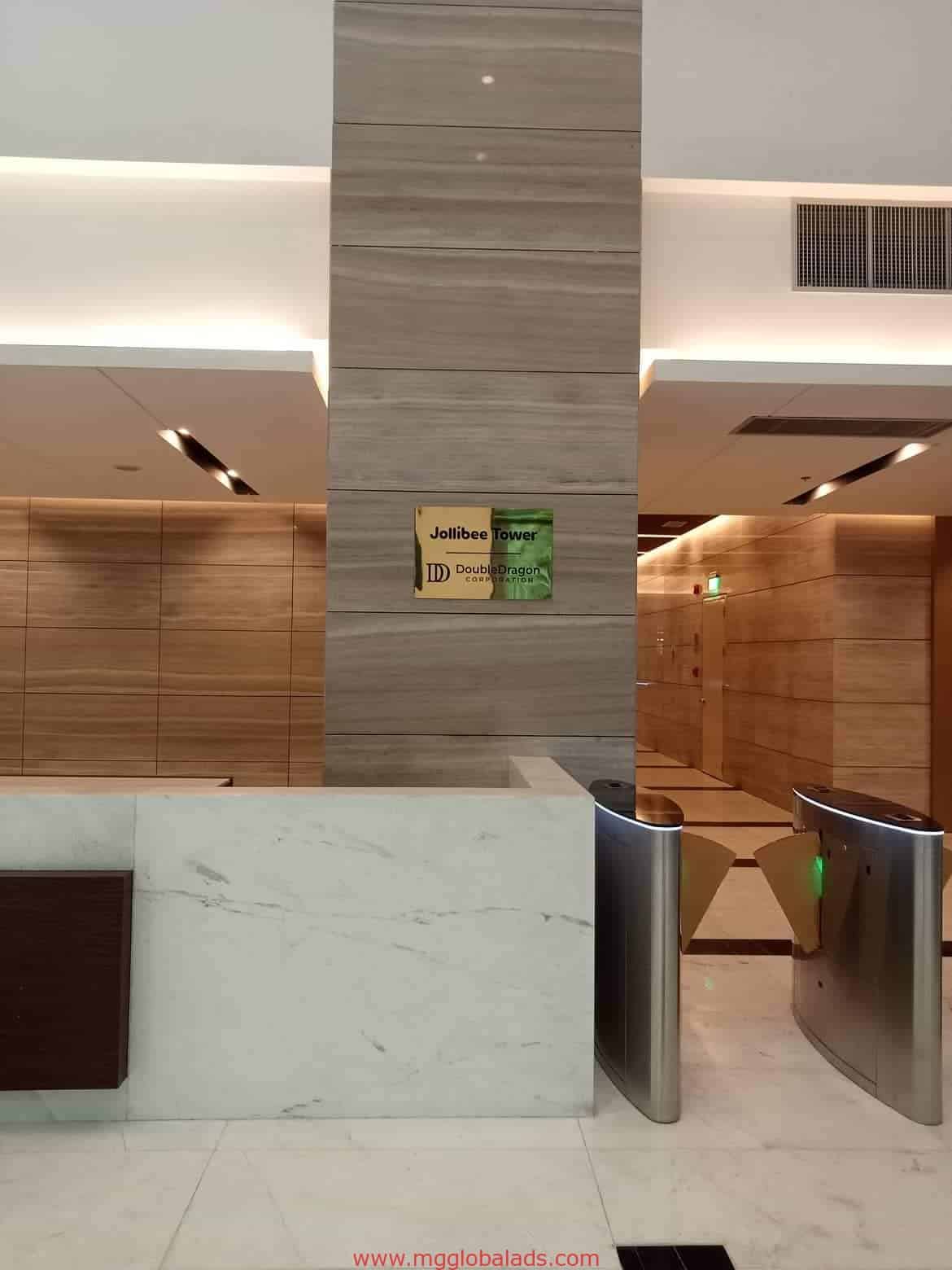 Acrylic signage for Jollibee Tower lobby in Ortigas with marble, wood paneling, and reception desk by M&G Global Ads.