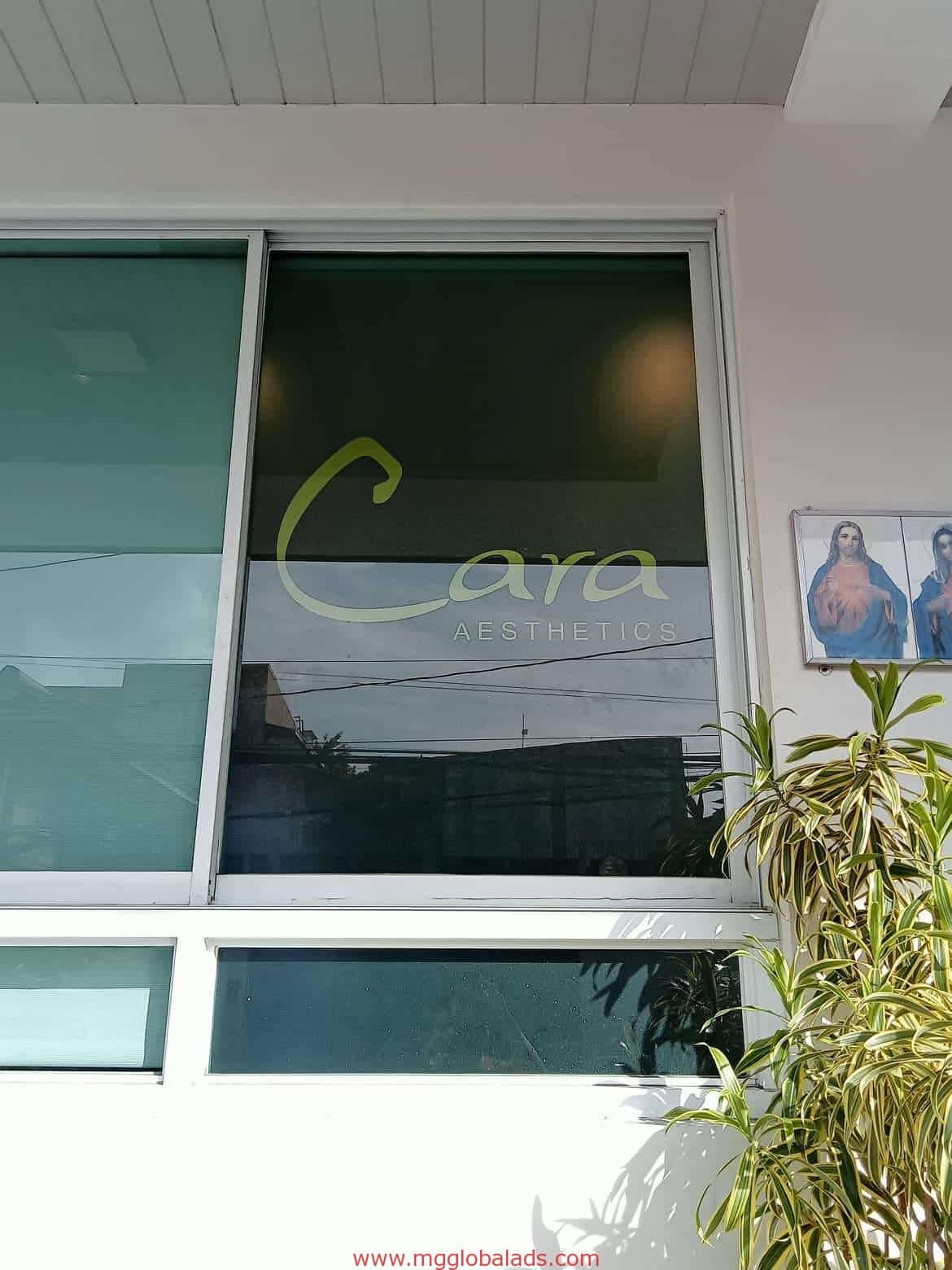 Cara Aesthetics glass window outdoor signage in Mandaluyong with potted plant and two religious images by M&G Global Ads.