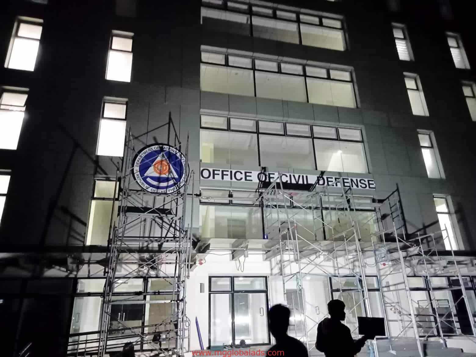 Metal LED signage for Office of Civil Defense on building with scaffolding at night in Quezon City by M&G Global Ads.