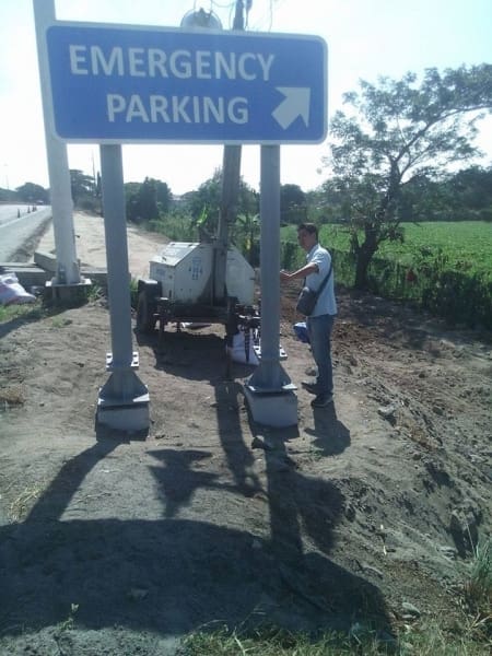 A man stands under an aluminum outdoor Emergency Parking sign in Metro Manila, sign maker Philippines by M&G Global Ads.