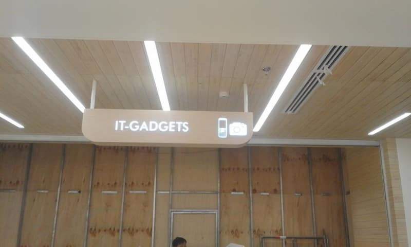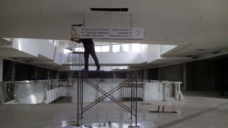 Worker on scaffolding near wayfinding indoor acrylic signage in mall, Metro Manila. Sign maker Philippines by M&G Global Ads.