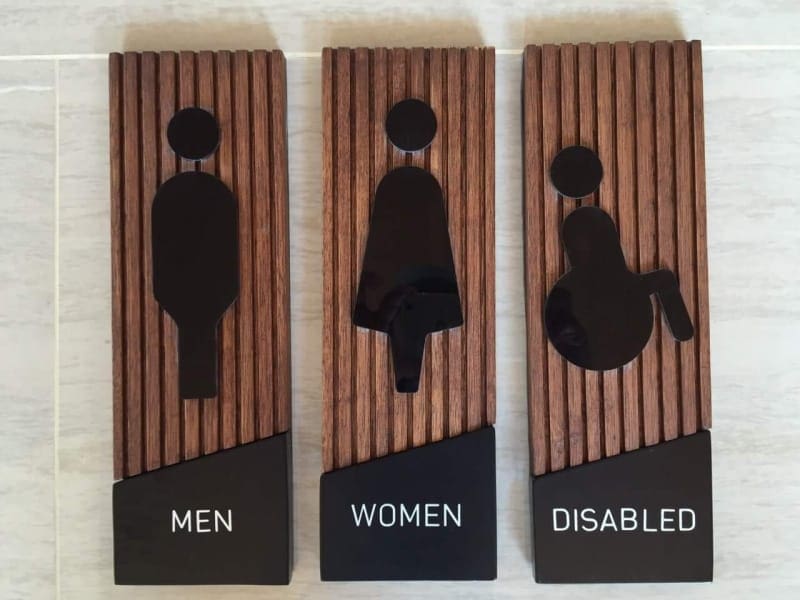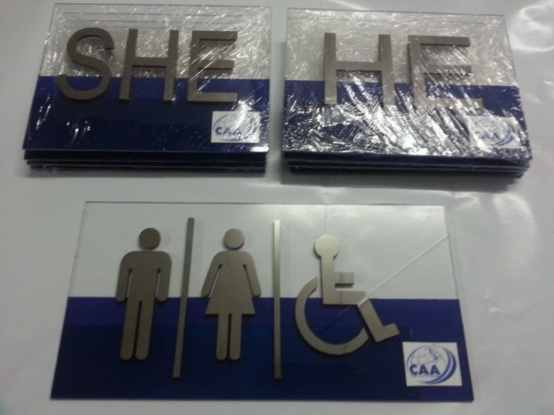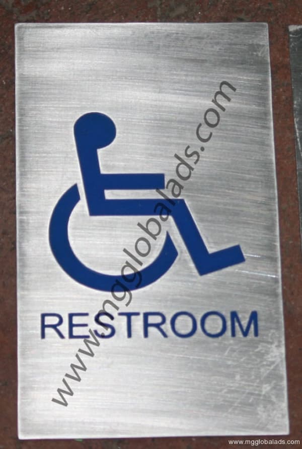 Stainless steel restroom signage with blue wheelchair symbol, Metro Manila, sign maker Philippines by M&G Global Ads.