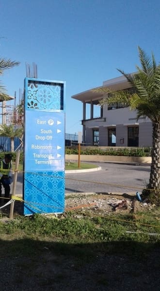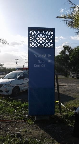 Outdoor acrylic wayfinding signage, blue directional sign at transport terminal, Metro Manila by sign maker Philippines M&G Global Ads.