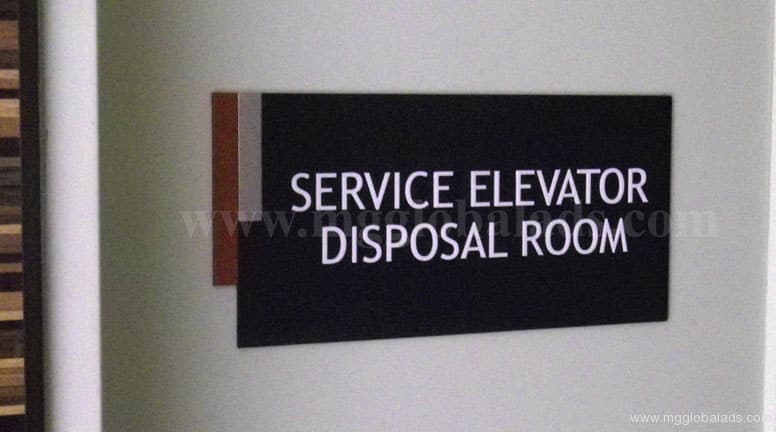Black acrylic indoor room signage with SERVICE ELEVATOR DISPOSAL ROOM text, Metro Manila, sign maker Philippines by M&G Global Ads.
