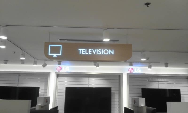 Dimly lit Metro Manila store with indoor acrylic price signage, overhead shelf lights, sign maker Philippines by M&G Global Ads.