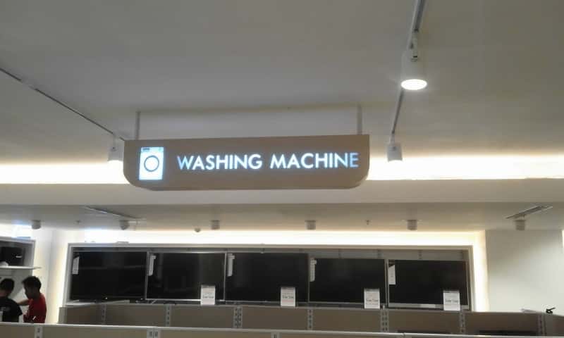 Indoor acrylic hanging signage with WASHING MACHINE text, illuminated in a store, Metro Manila. Sign maker Philippines by M&G Global Ads.