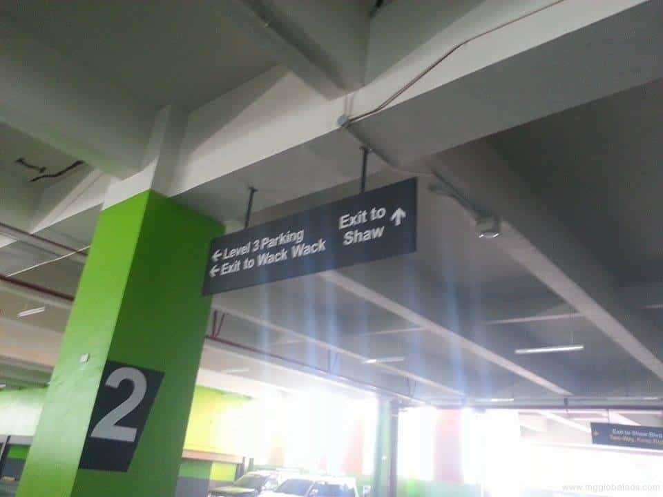 Parking signage, wayfinding acrylic ceiling sign in parking garage, Exit to Wack Wack/Shaw, Metro Manila sign maker Philippines by M&G Global Ads.