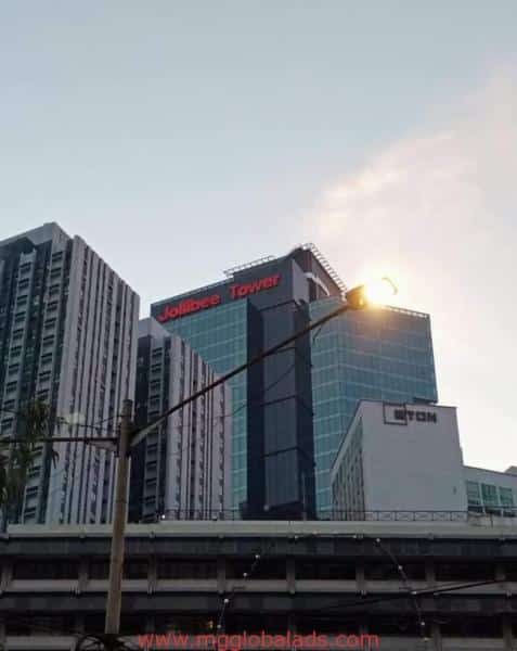 Jollibee Tower building acrylic signage on tall glass office in Metro Manila, sign maker Philippines by M&G Global Ads.