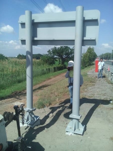 Outdoor aluminum roadside signage on metal poles, sunny day, grass and road—sign maker Philippines by M&G Global Ads.