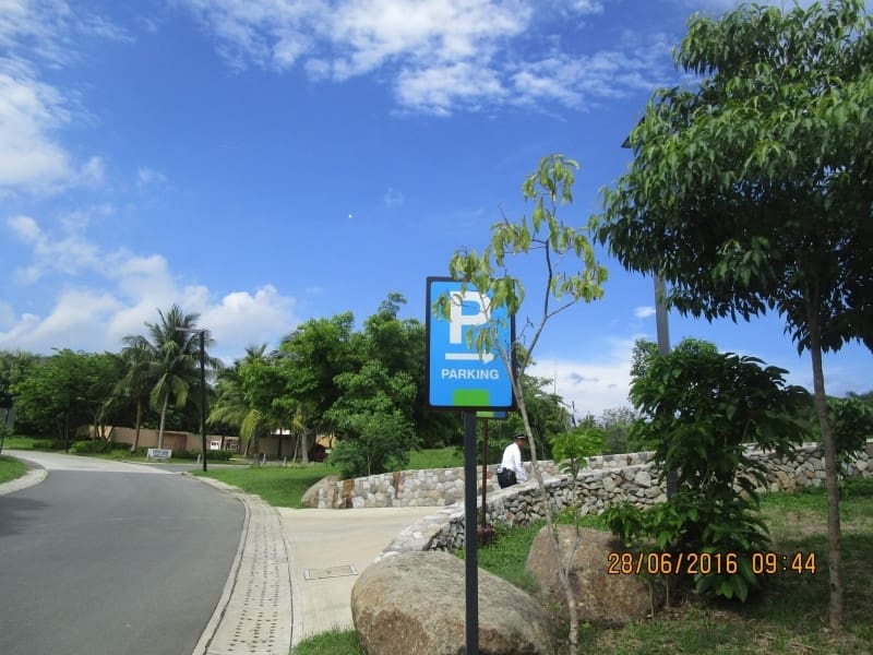 Outdoor blue parking sign beside a curved road, greenery, and rocks in the Philippines by sign maker Philippines M&G Global Ads.