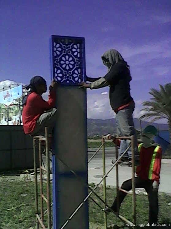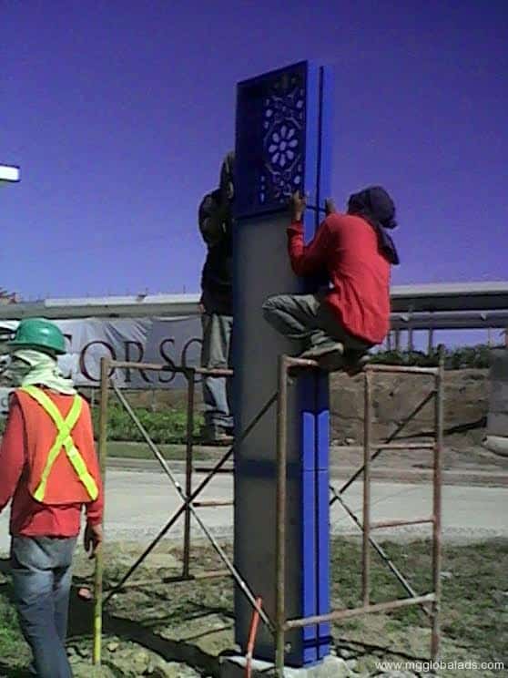 Three people install an outdoor acrylic signage panel using scaffolding in Metro Manila, sign maker Philippines by M&G Global Ads.