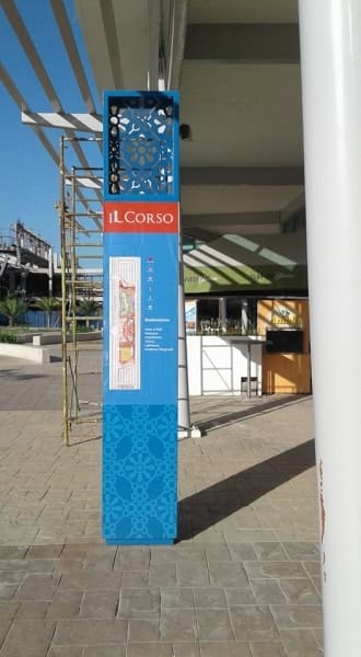 Outdoor pylon directory signage for IL CORSO, Metro Manila by sign maker Philippines M&G Global Ads. Scaffolding, buildings in bg.