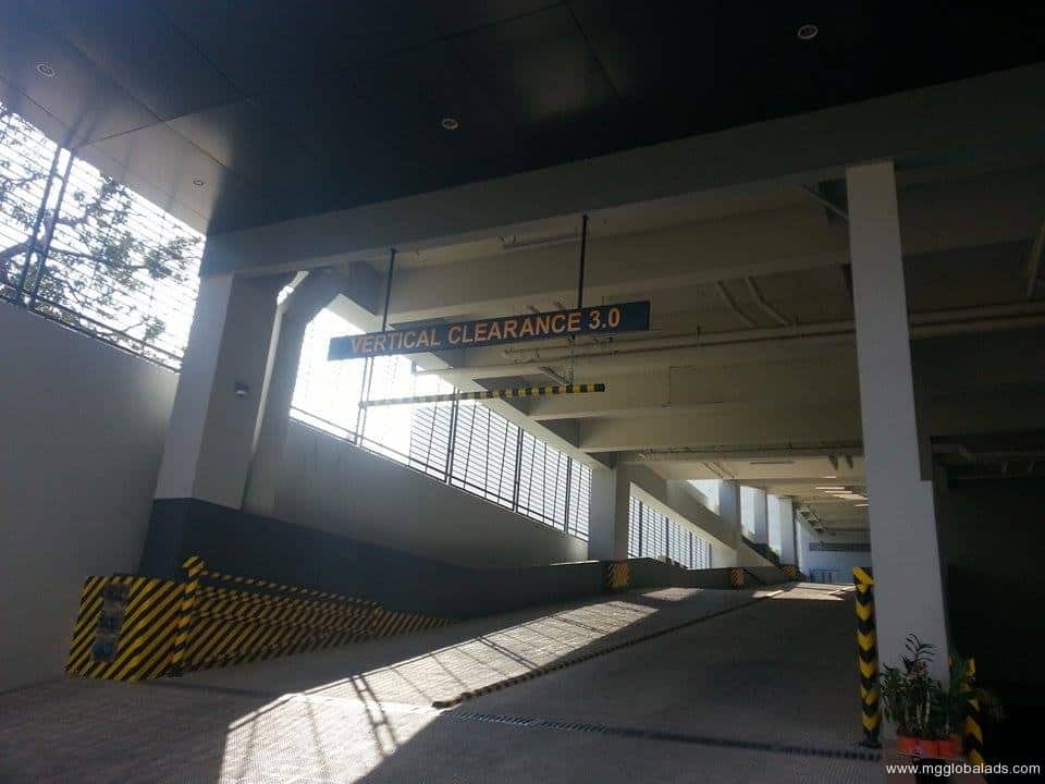 Parking garage entrance with aluminum vertical clearance signage, safety stripes; sign maker Philippines by M&G Global Ads.
