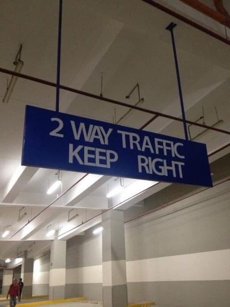 Parking wayfinding acrylic overhead sign in blue, 2 WAY TRAFFIC KEEP RIGHT, Metro Manila. Sign maker Philippines by M&G Global Ads.