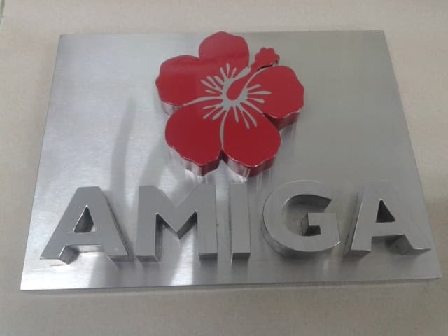 Stainless steel building signage AMIGA with silver letters and red flower, Metro Manila, sign maker Philippines by M&G Global Ads.