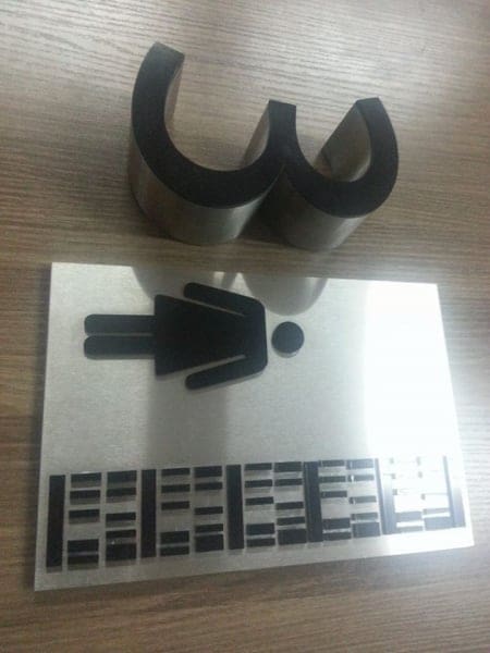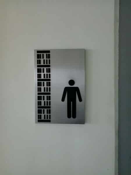 Stainless steel restroom sign with black stick figure and binary code bars, indoor signage Metro Manila, sign maker Philippines by M&G Global Ads.