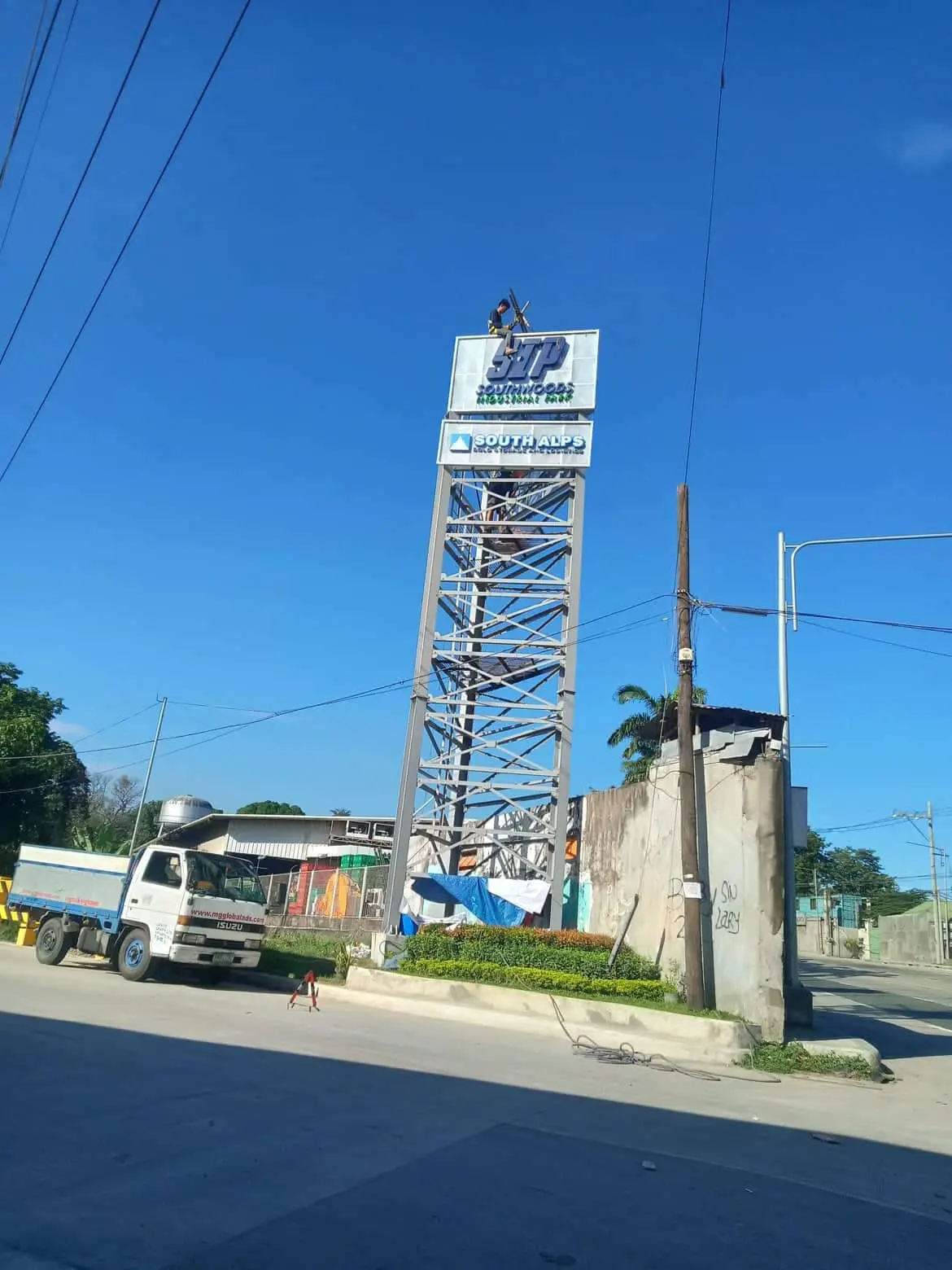 Building signage installation by a worker on scaffolding in Makati, large yellow outdoor sign, by M&G Global Ads.