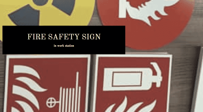 Fire safety building signage with radiation, flames, and extinguisher icons in Ortigas by M&G Global Ads.