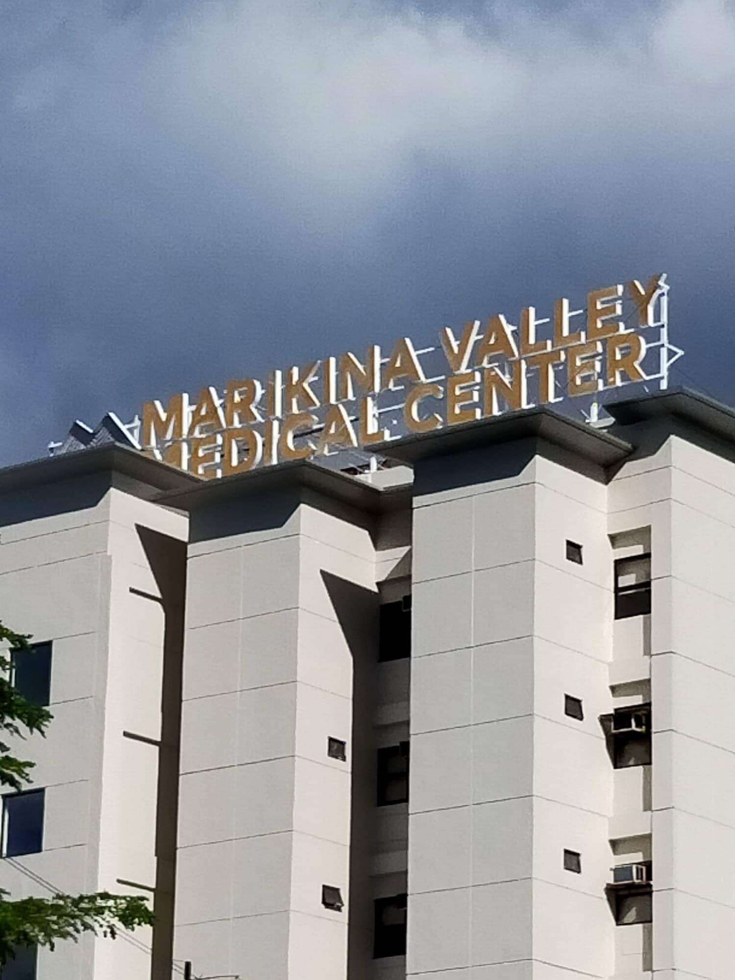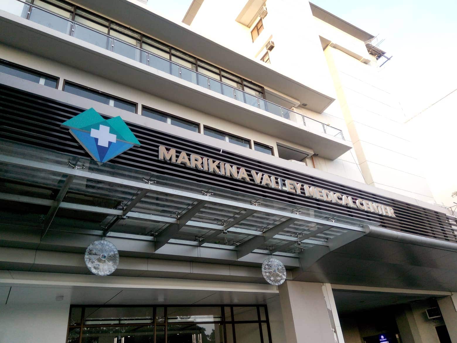 Outdoor building signage for Marikina Valley Medical Center with name and blue cross logo in Pasig by M&G Global Ads.