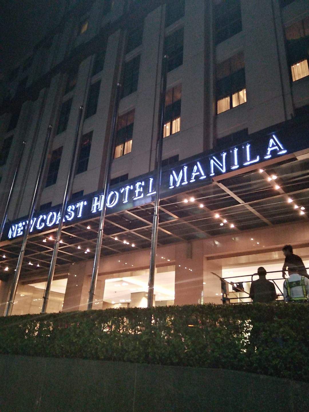 Illuminated LED hotel signage for New Coast Hotel Manila, Quezon City, with flagpoles at night by M&G Global Ads.