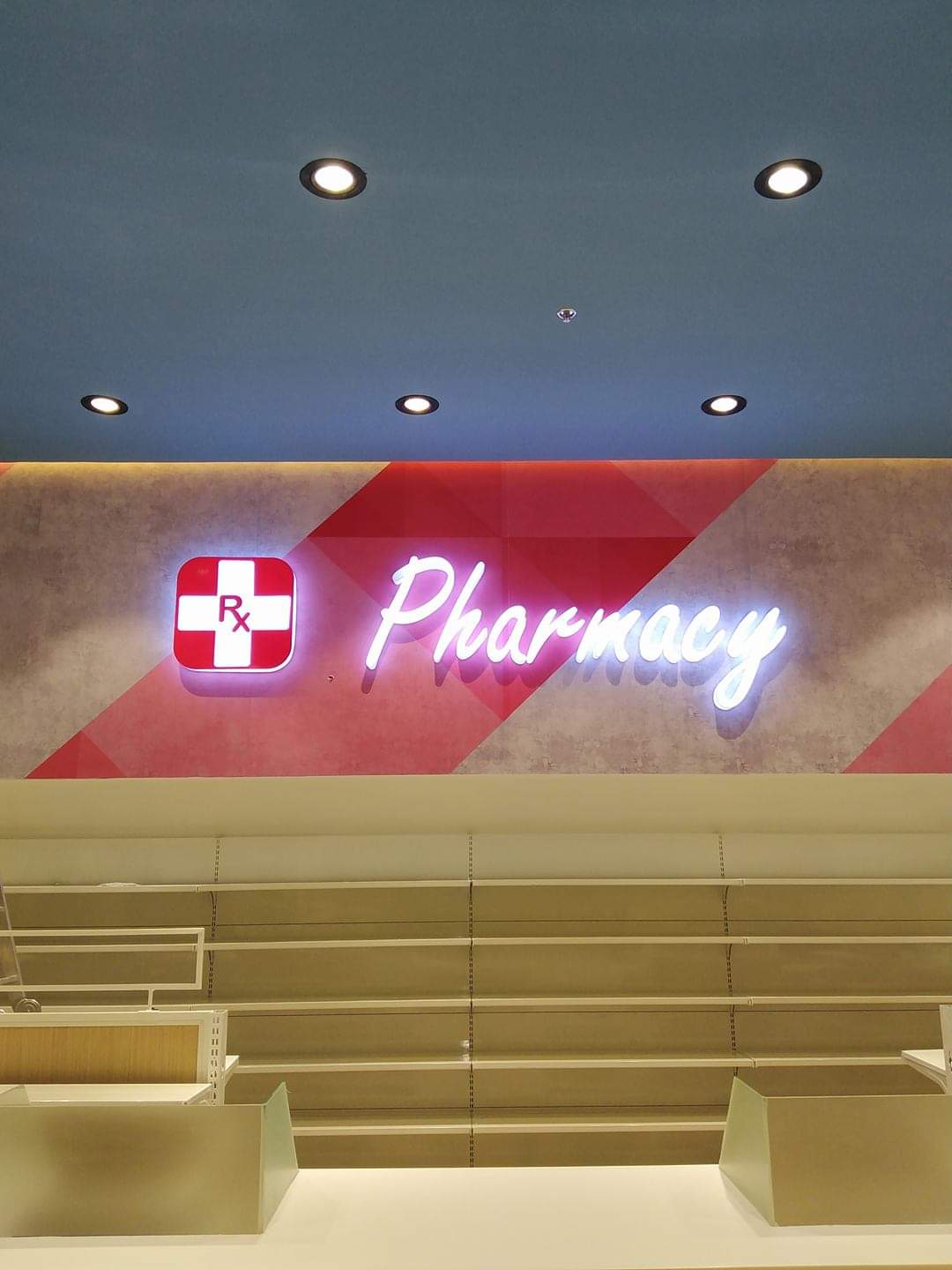 Pharmacy LED signage with Rx symbol, store shelving, blue ceiling in Makati. Custom signage by M&G Global Ads.