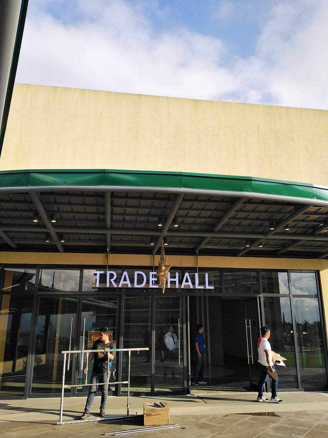 Acrylic signage installation for Trade Hall, with workers and tools at entrance in Quezon City by M&G Global Ads.