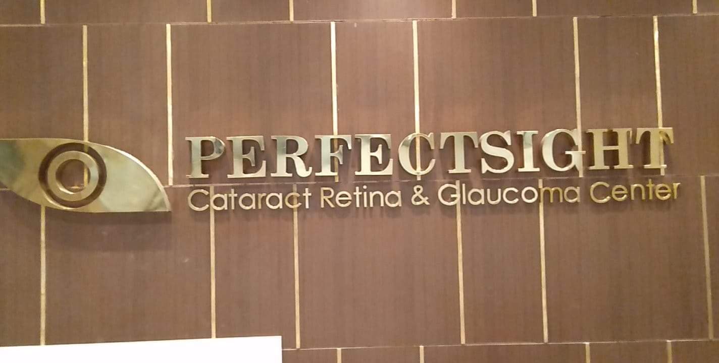LED signage for PERFECTSIGHT Cataract Retina & Glaucoma Center in Ortigas, gold letters and eye logo, by M&G Global Ads.