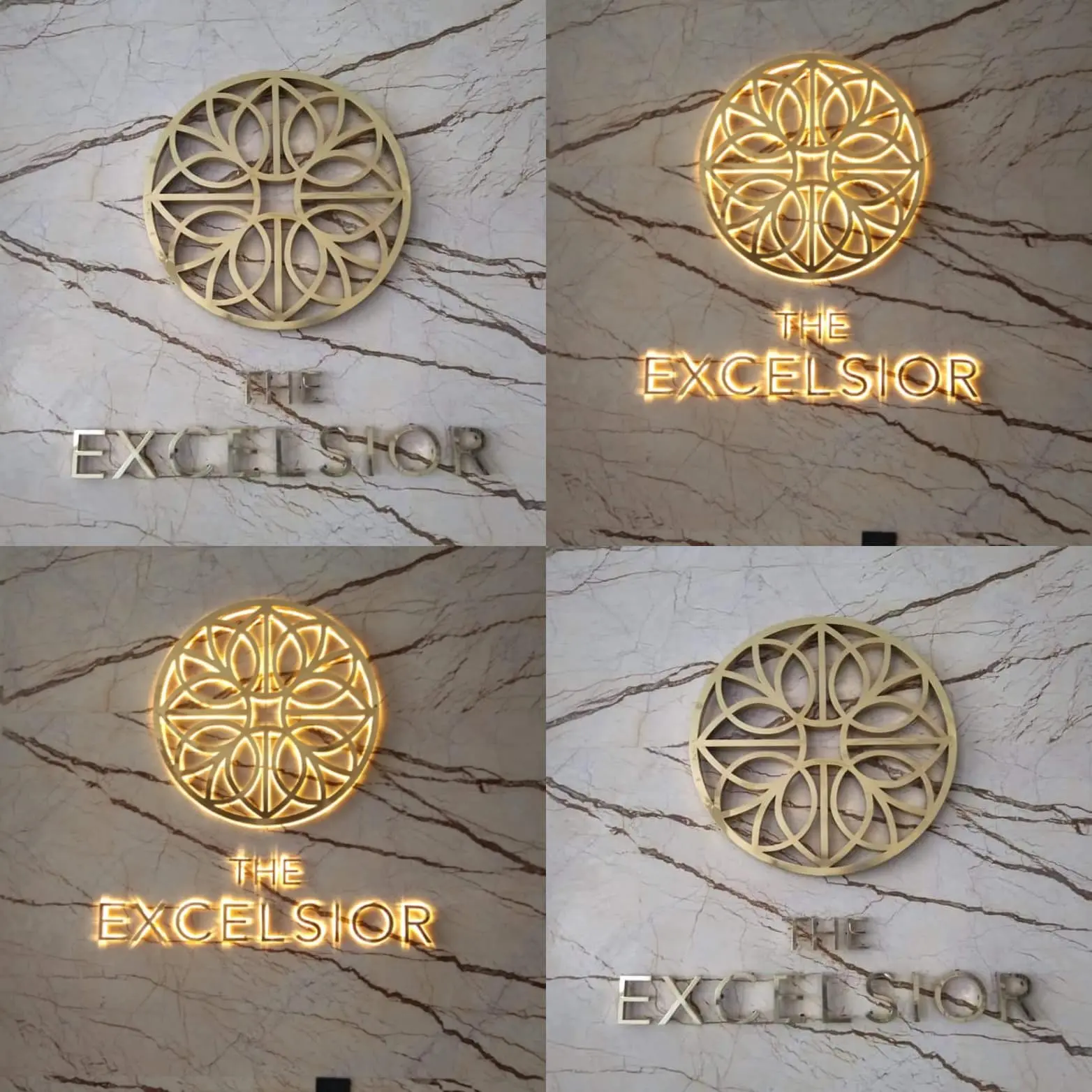 Hotel lobby metal signage for The Excelsior in Makati with gold geometric design and lighting effects, by M&G Global Ads.