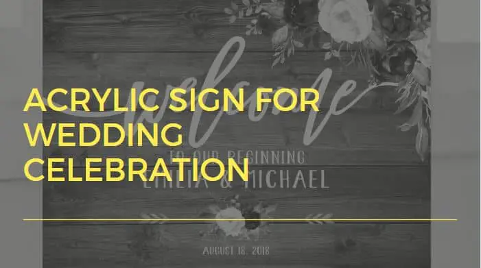 Acrylic wedding sign with floral decor and bold yellow letters in Makati, wooden background. Custom signage by M&G Global Ads.