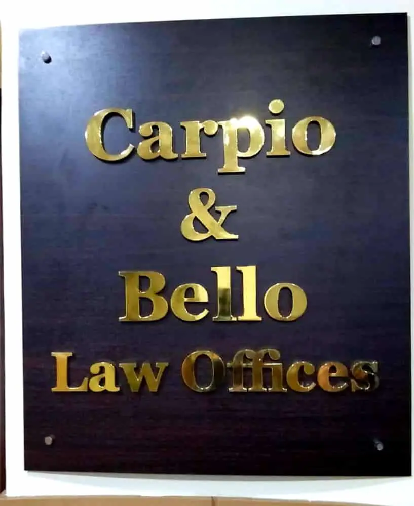 Indoor wooden signage plaque for Carpio & Bello Law Offices in Makati with gold lettering by M&G Global Ads.