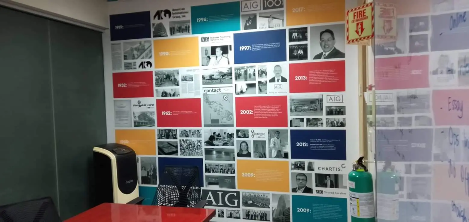 AIG timeline wall signage in an office room with a red table, black chairs, Makati location by M&G Global Ads.