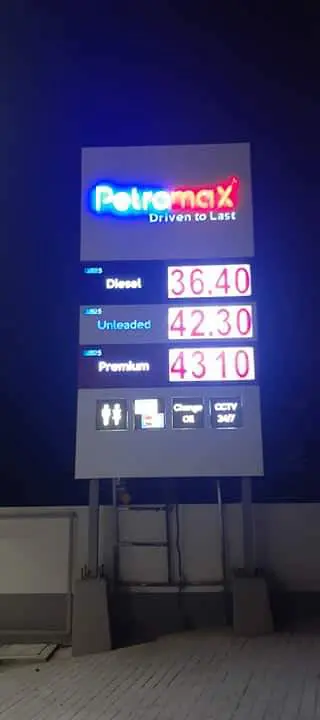 Petromax gas station LED signage in Makati shows Diesel, Unleaded, Premium prices; payment & CCTV icons. by M&G Global Ads.