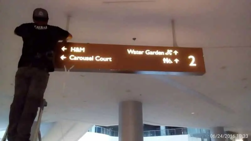 Worker installs brown overhead acrylic indoor mall wayfinding directory signage, Metro Manila, sign maker Philippines by M&G Global Ads.