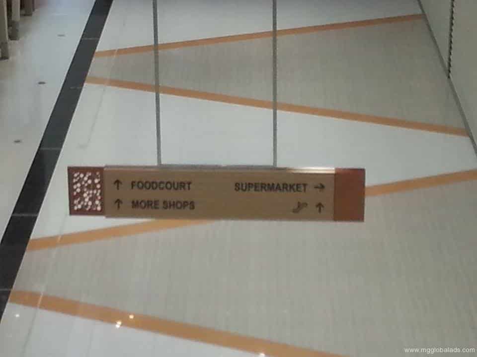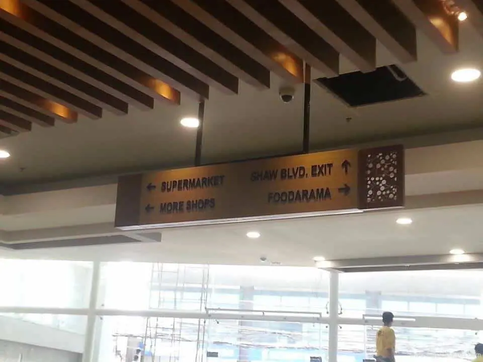 Indoor wayfinding acrylic hanging sign in a mall, brown with black text, Metro Manila, sign maker Philippines by M&G Global Ads.
