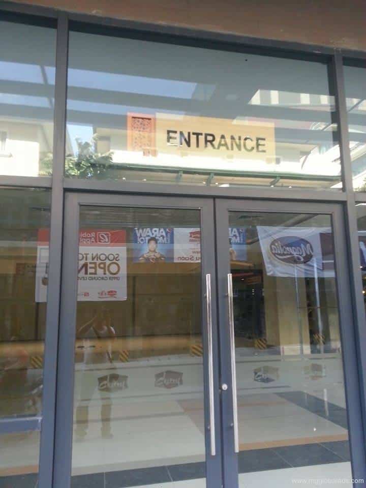 Acrylic ENTRANCE building signage above glass double doors at shopping complex, Metro Manila. Sign maker Philippines by M&G Global Ads.