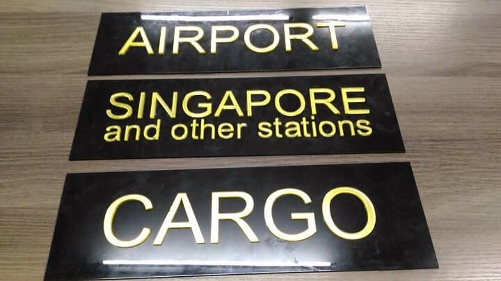 Acrylic wayfinding signs with yellow text for airport, Singapore, cargo; on wood. Sign maker Philippines by M&G Global Ads.