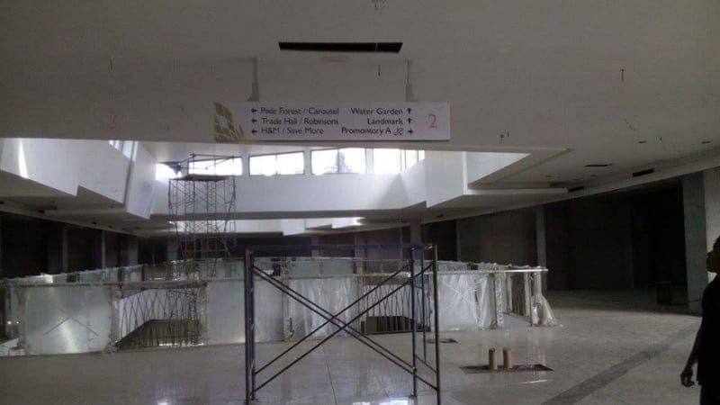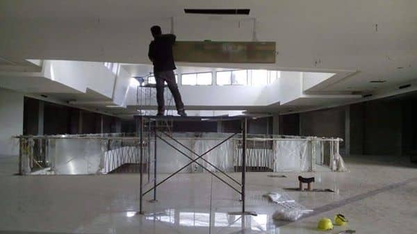 Dim indoor room with scaffolding, construction, acrylic wayfinding signage. Metro Manila sign maker Philippines by M&G Global Ads.