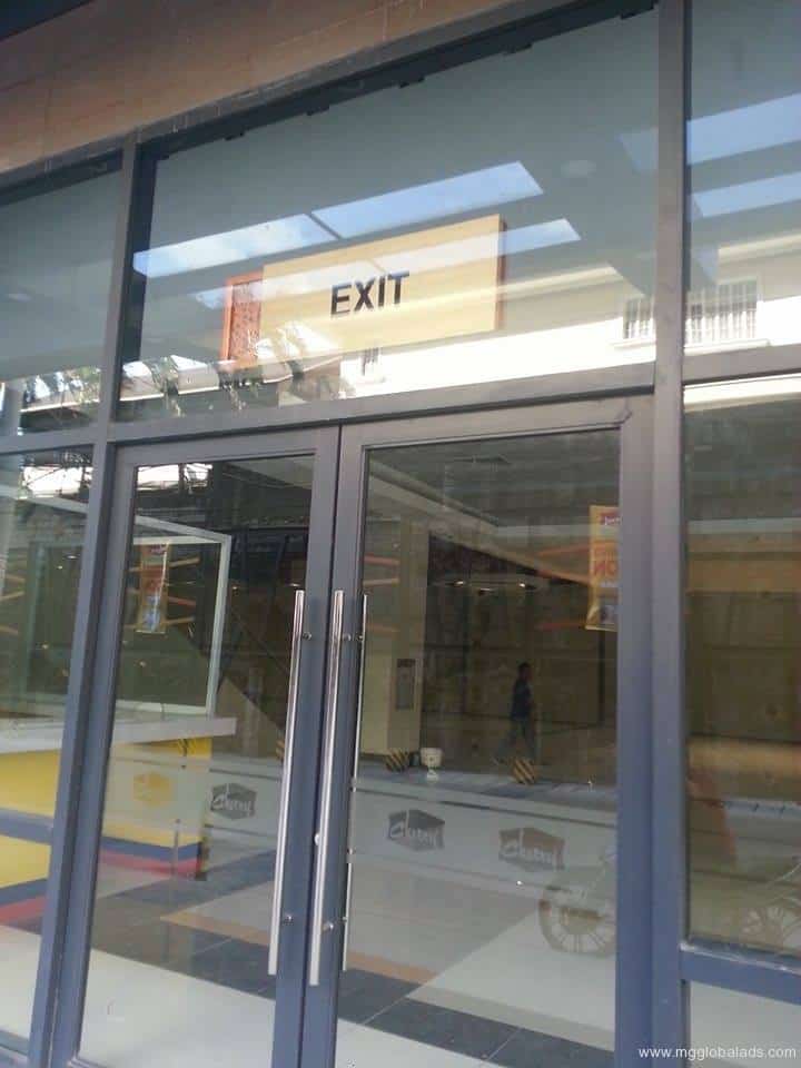 Indoor acrylic EXIT signage above a glass door, exit handles only outside. Safety sign maker Philippines by M&G Global Ads.